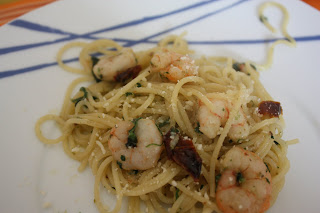 Esparguete, miolo de camarão, tomate seco, alho laminado, salsa, azeite
